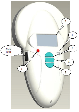 The T4S2013 Scanner is powered by a Lithium/ion battery (included). It can be recharged by connecting the reader to a USB port. An indicator on the right of the display (6) indicates the battery charge level. When the charge is too low the reader displays the following message: